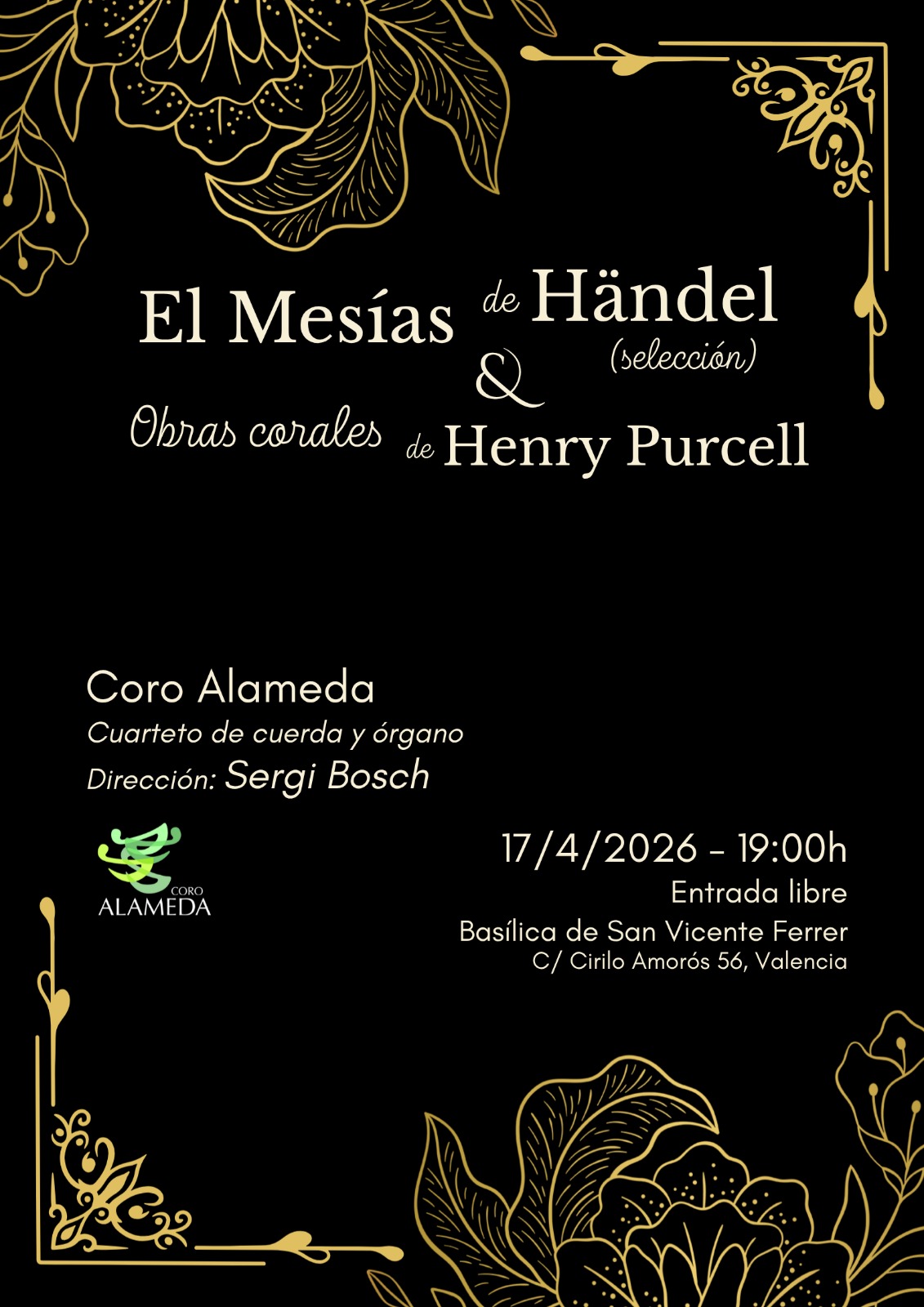 El próximo 17 de abril, viernes, a las 19h, el Coro Alameda ofrecerá una selección de obras de Henry Purcell y de El Mesías de Haendel acompañado por un magnífico cuarteto de cuerda y un organista. Promete ser un concierto inolvidable en el marco incomparable de la basílica de San Vicente Ferrer , c/ Cirilo Amorós, 56 de Valencia. Vamos, como para no perdérselo. Entrada libre hasta completar el aforo.